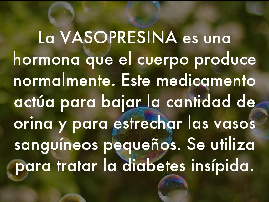 La VASOPRESINA es una hormona que el cuerpo produce normalmente. Este medicamento actúa para bajar la cantidad de orina y para estrechar las vasos sanguíneos pequeños. Se utiliza para tratar la diabetes insípida.