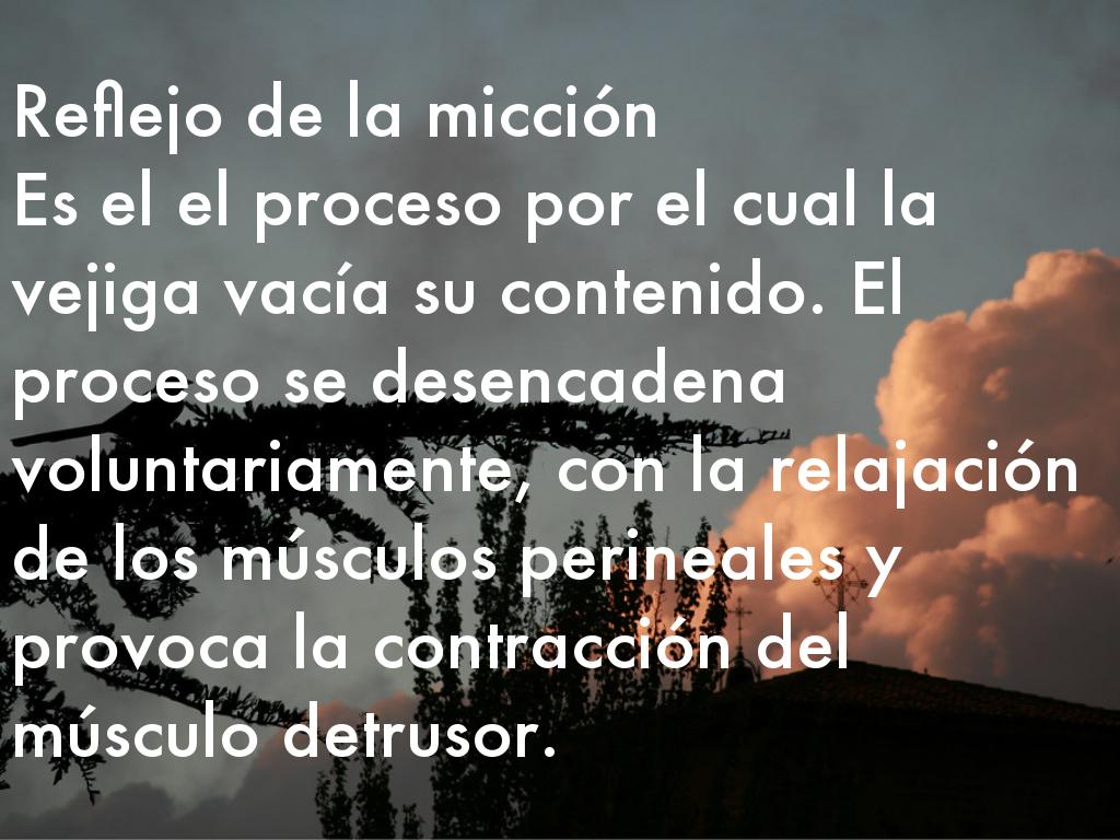 Reflejo de la micción Es el el proceso por el cual la vejiga vacía su contenido. El proceso se desencadena voluntariamente, con la relajación de los músculos perineales y provoca la contracción del músculo detrusor.