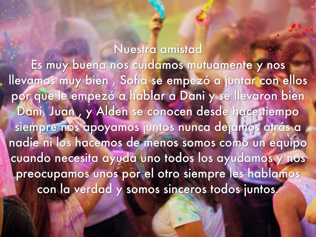 Nuestra amistad Es muy buena nos cuidamos mutuamente y nos llevamos muy bien , Sofía se empezó a juntar con ellos por que le empezó a hablar a Dani y se llevaron bien Dani, Juan , y Alden se conocen desde hace tiempo siempre nos apoyamos juntos nunca dejamos atrás a nadie ni los hacemos de menos somos como un equipo cuando necesita ayuda uno todos los ayudamos y nos preocupamos unos por el otro siempre les hablamos con la verdad y somos sinceros todos juntos.