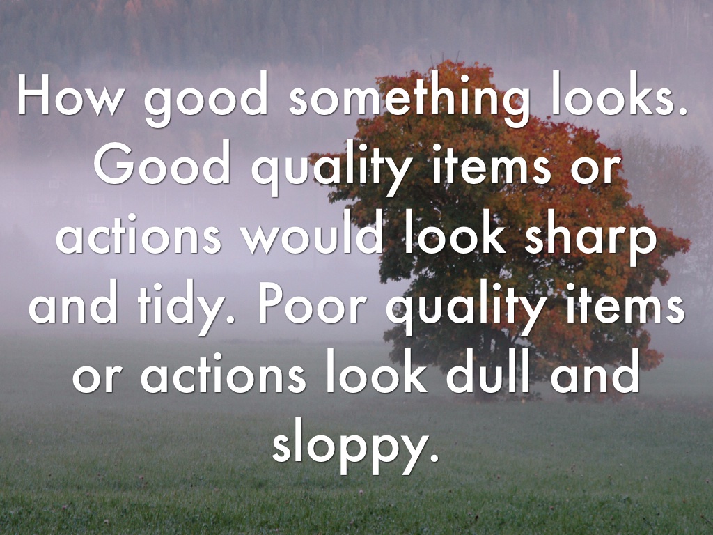 How good something looks. Good quality items or actions would look sharp and tidy. Poor quality items or actions look dull and sloppy.
