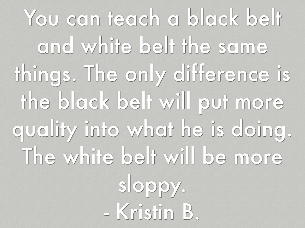 You can teach a black belt and white belt the same things. The only difference is the black belt will put more quality into what he is doing. The white belt will be more sloppy.