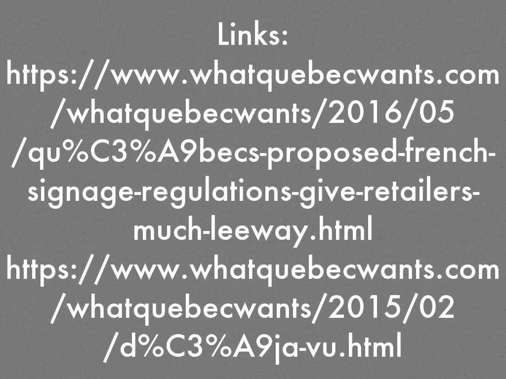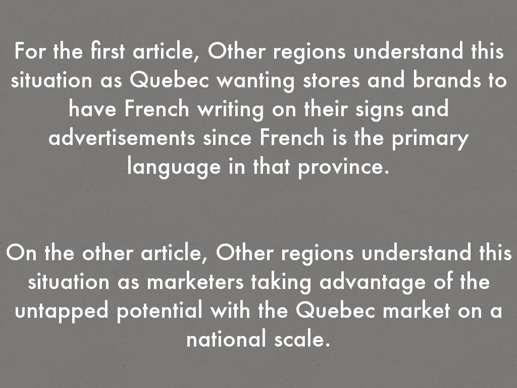For the first article, Other regions understand this situation as Quebec wanting stores and brands to have French writing on their signs and advertisements since French is the primary language in that province.