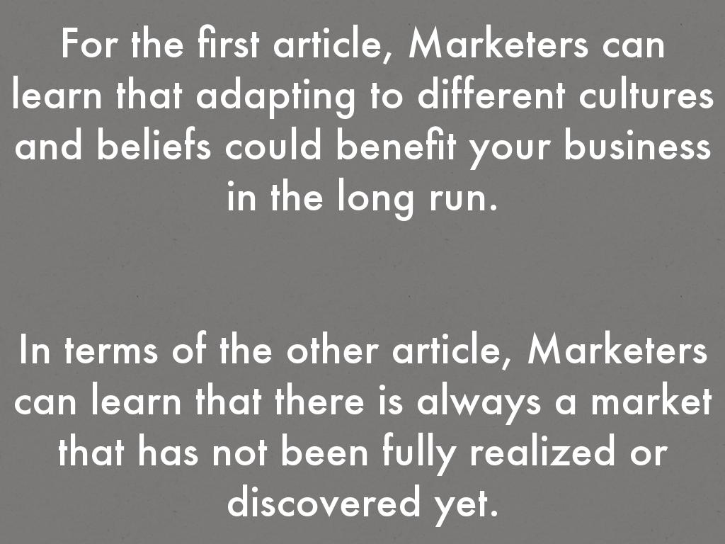 For the first article, Marketers can learn that adapting to different cultures and beliefs could benefit your business in the long run.