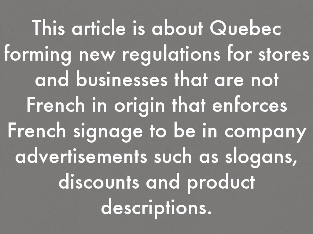 This article is about Quebec forming new regulations for stores and businesses that are not French in origin that enforces French signage to be in company advertisements such as slogans, discounts and product descriptions.