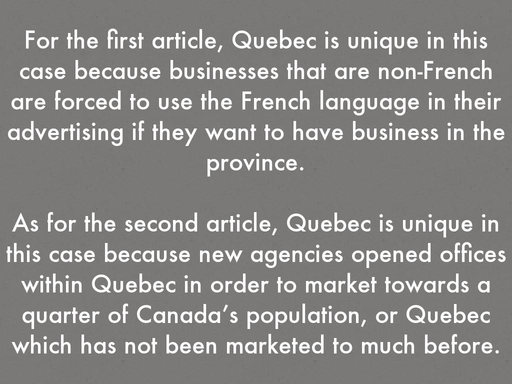 For the first article, Quebec is unique in this case because businesses that are non-French are forced to use the French language in their advertising if they want to have business in the province.