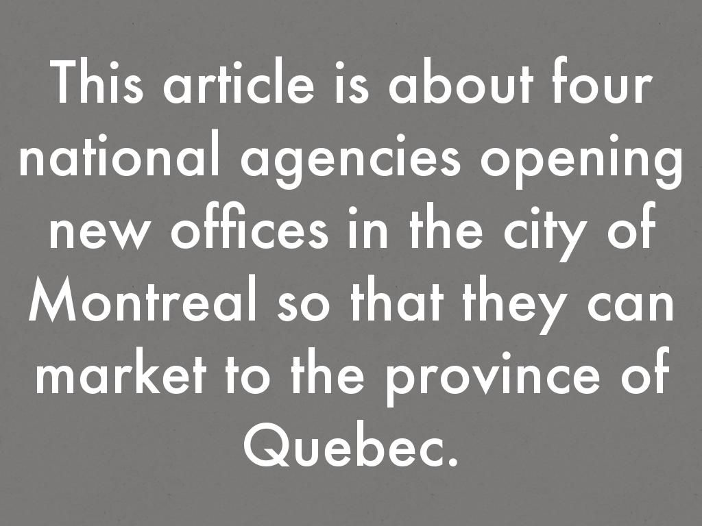 This article is about four national agencies opening new offices in the city of Montreal so that they can market to the province of Quebec.
