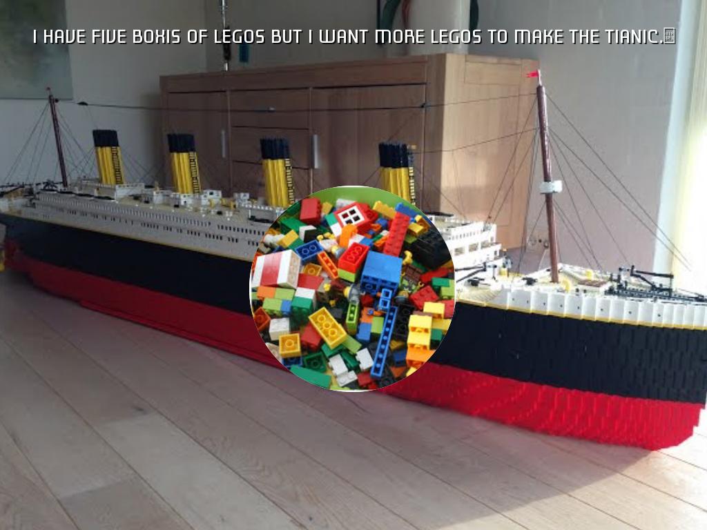 I HAVE FIVE BOXIS OF LEGOS BUT I WANT MORE LEGOS TO MAKE THE TIANIC.🛳