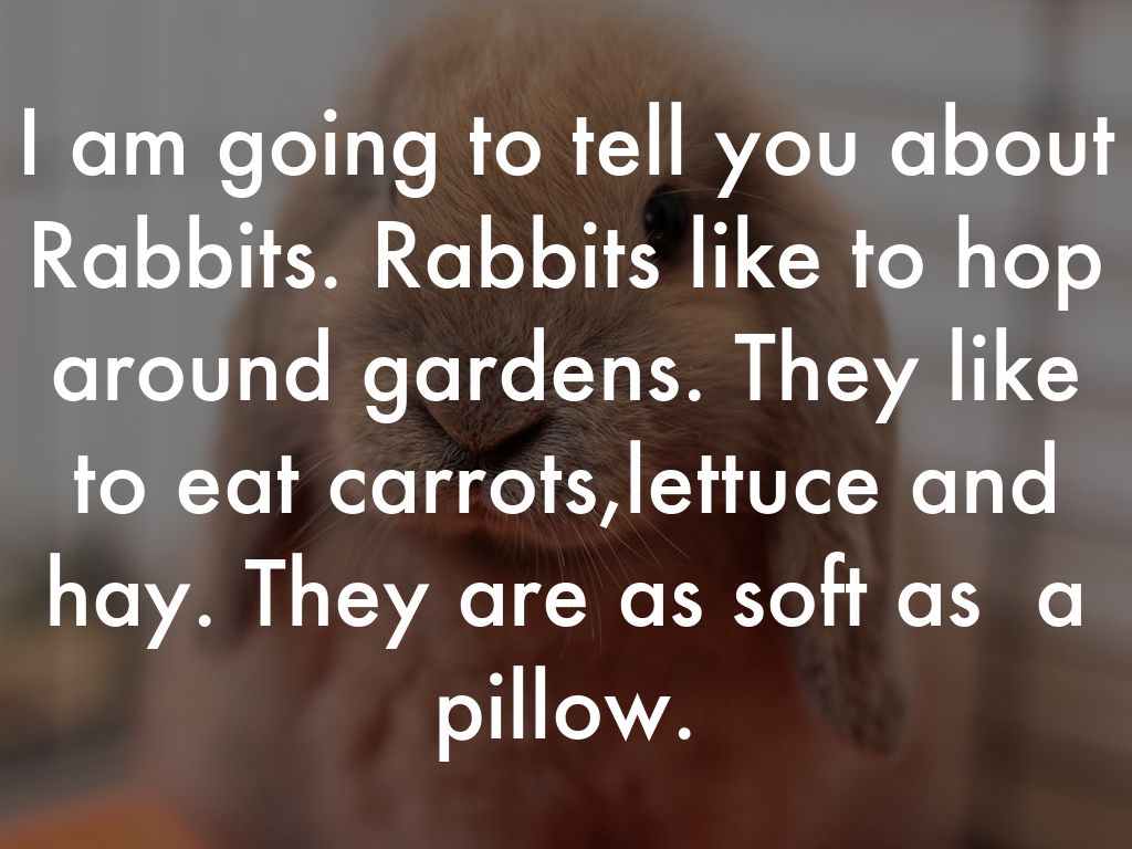 I am going to tell you about Rabbits. Rabbits like to hop around gardens. They like to eat carrots,lettuce and hay. They are as soft as a pillow.