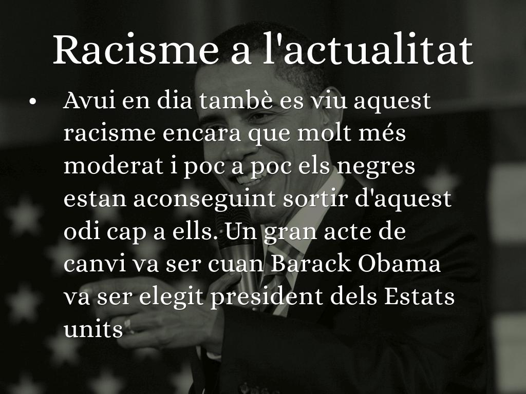Avui en dia tambè es viu aquest racisme encara que molt més moderat i poc a poc els negres estan aconseguint sortir d'aquest odi cap a ells. Un gran acte de canvi va ser cuan Barack Obama va ser elegit president dels Estats units
