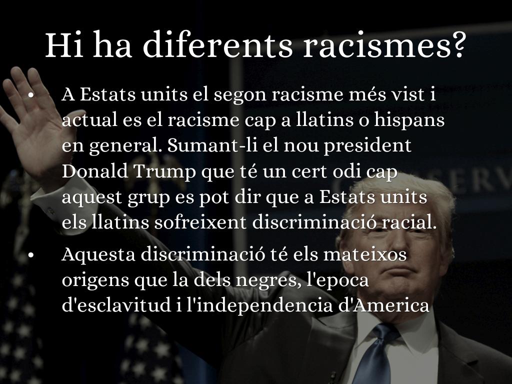 A Estats units el segon racisme més vist i actual es el racisme cap a llatins o hispans en general. Sumant-li el nou president Donald Trump que té un cert odi cap aquest grup es pot dir que a Estats units els llatins sofreixent discriminació racial.