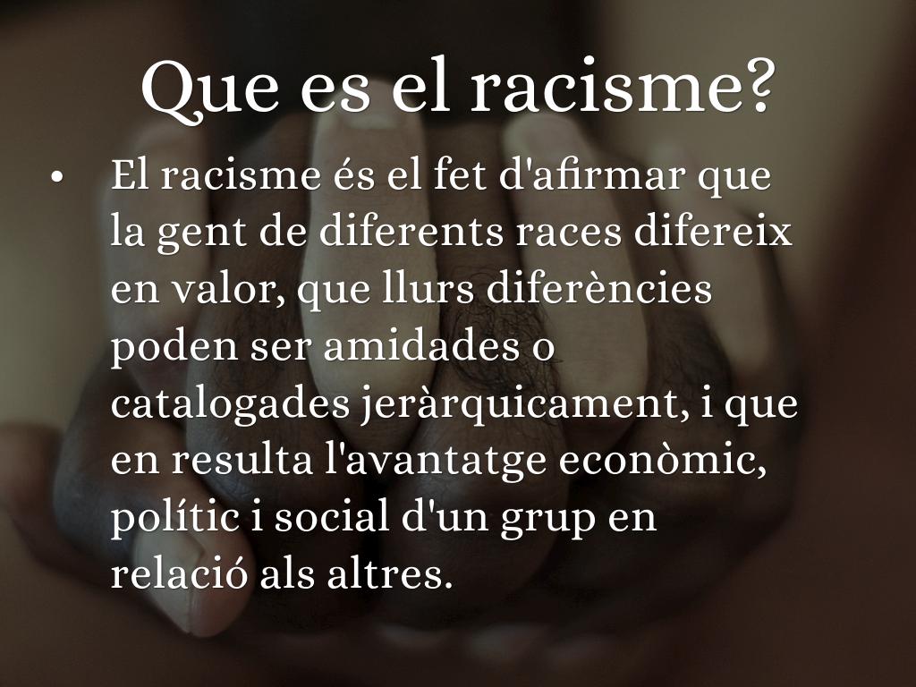 El racisme és el fet d'afirmar que la gent de diferents races difereix en valor, que llurs diferències poden ser amidades o catalogades jeràrquicament, i que en resulta l'avantatge econòmic, polític i social d'un grup en relació als altres.