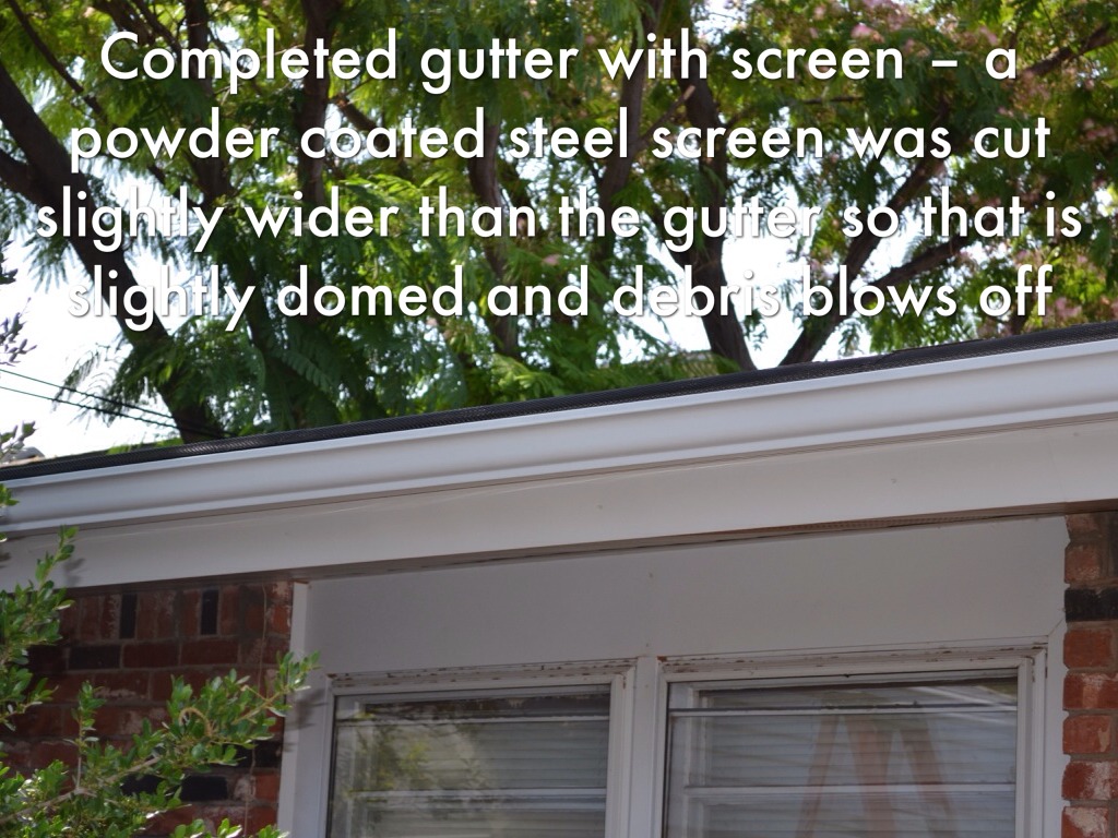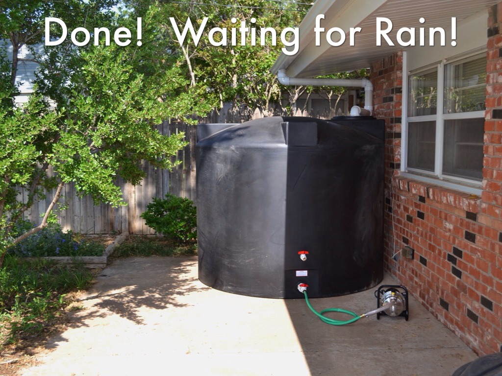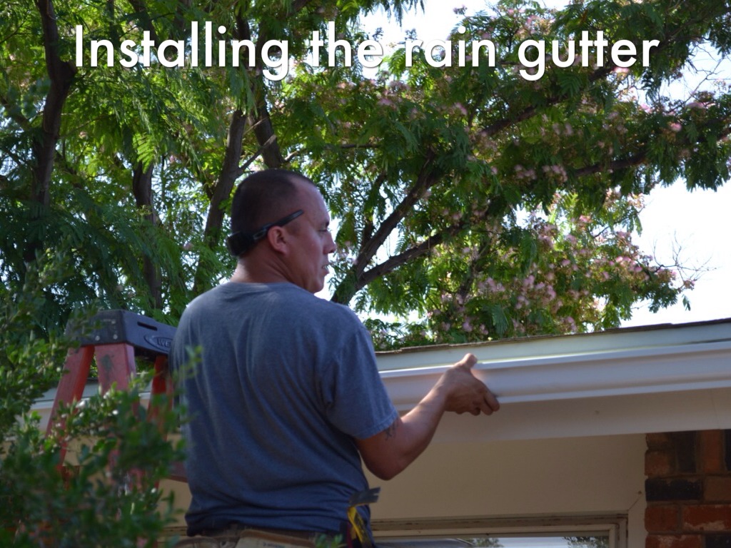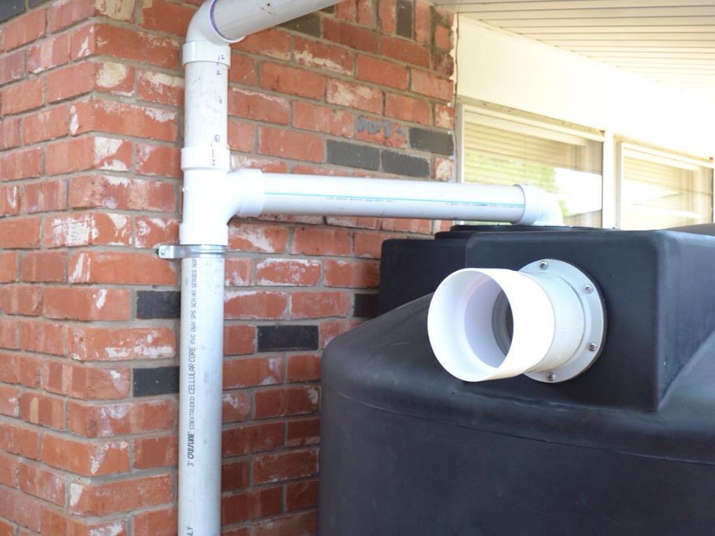 Complete set up – you can see the gutter, the first flush pipe, the intake pipe, and overflow outlet. The intake and overflow pipes are protected by screens to keep insects out