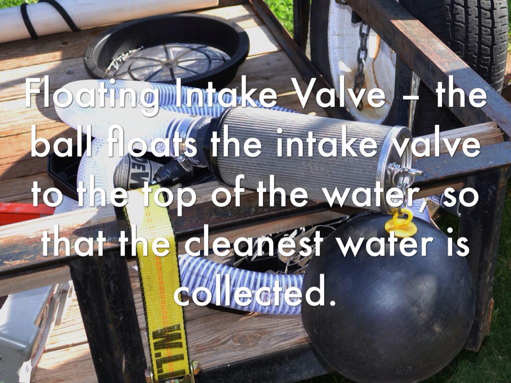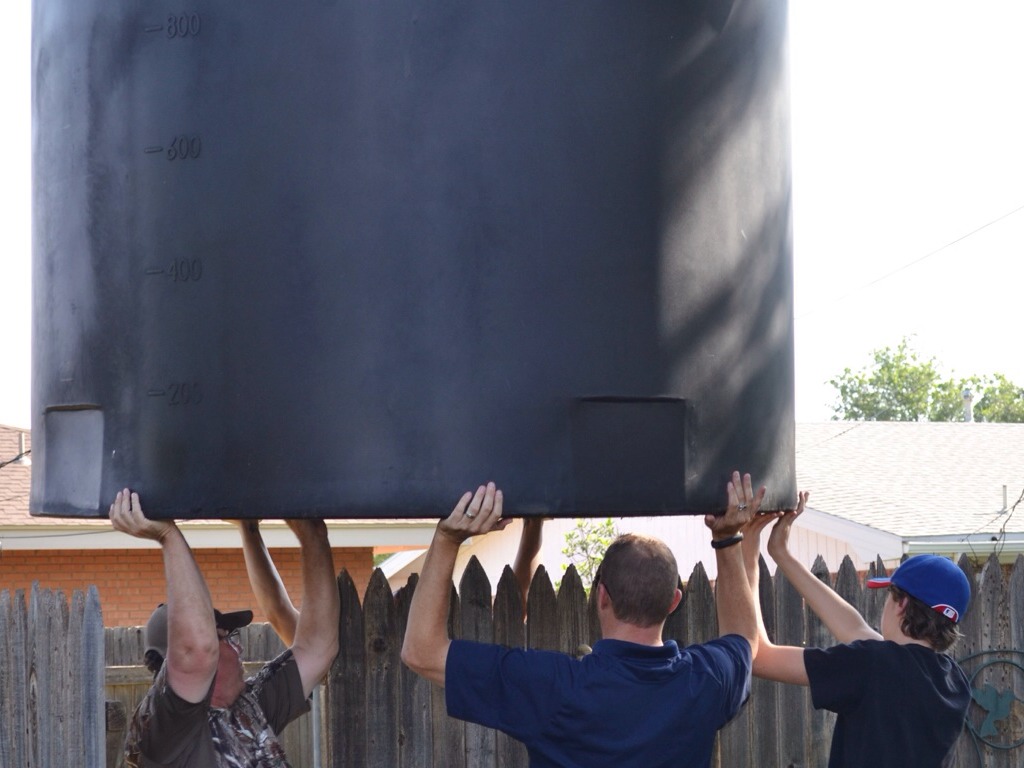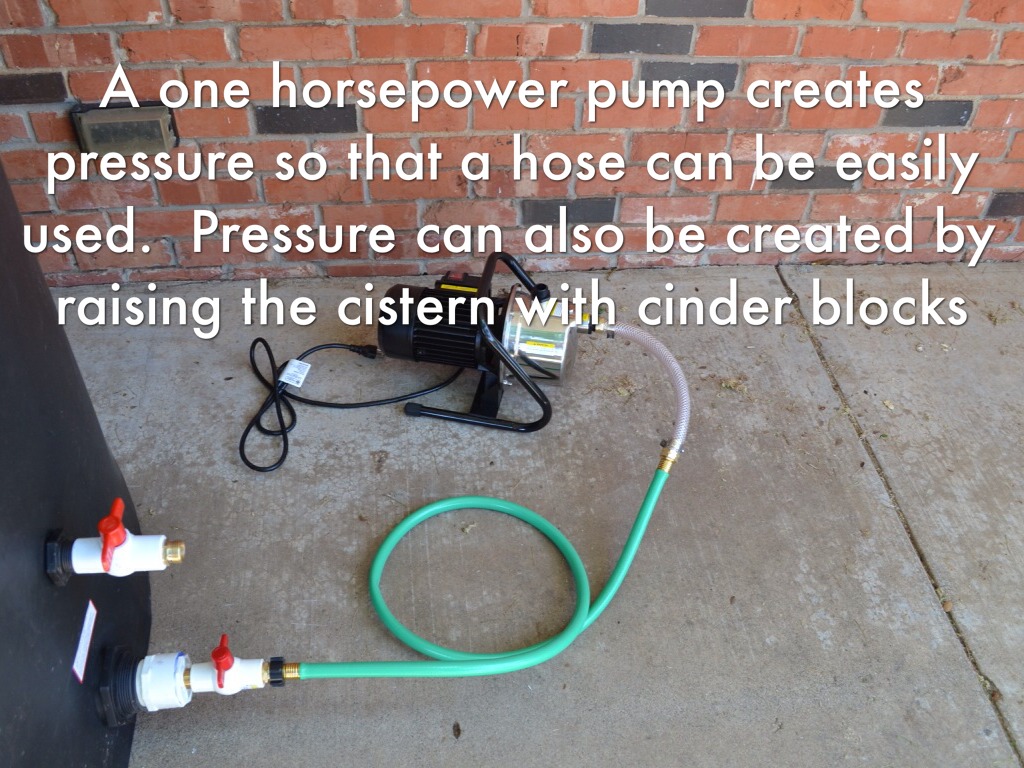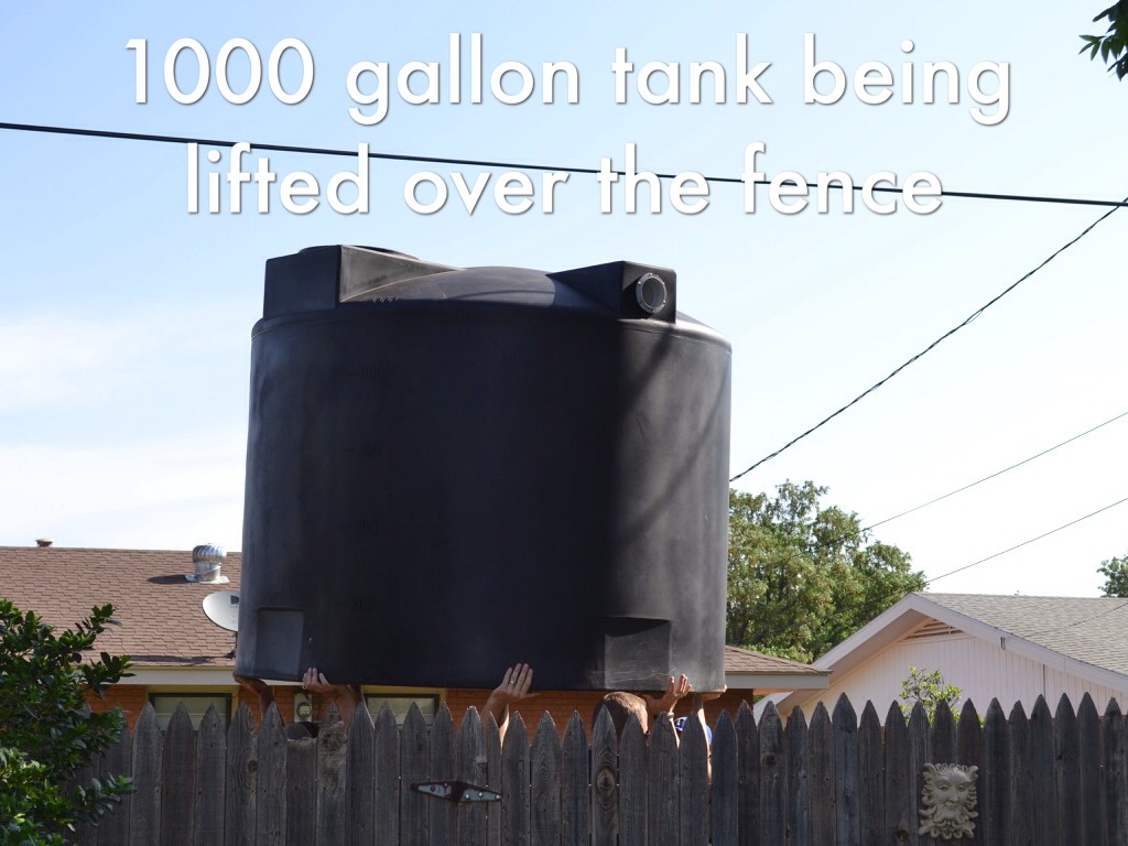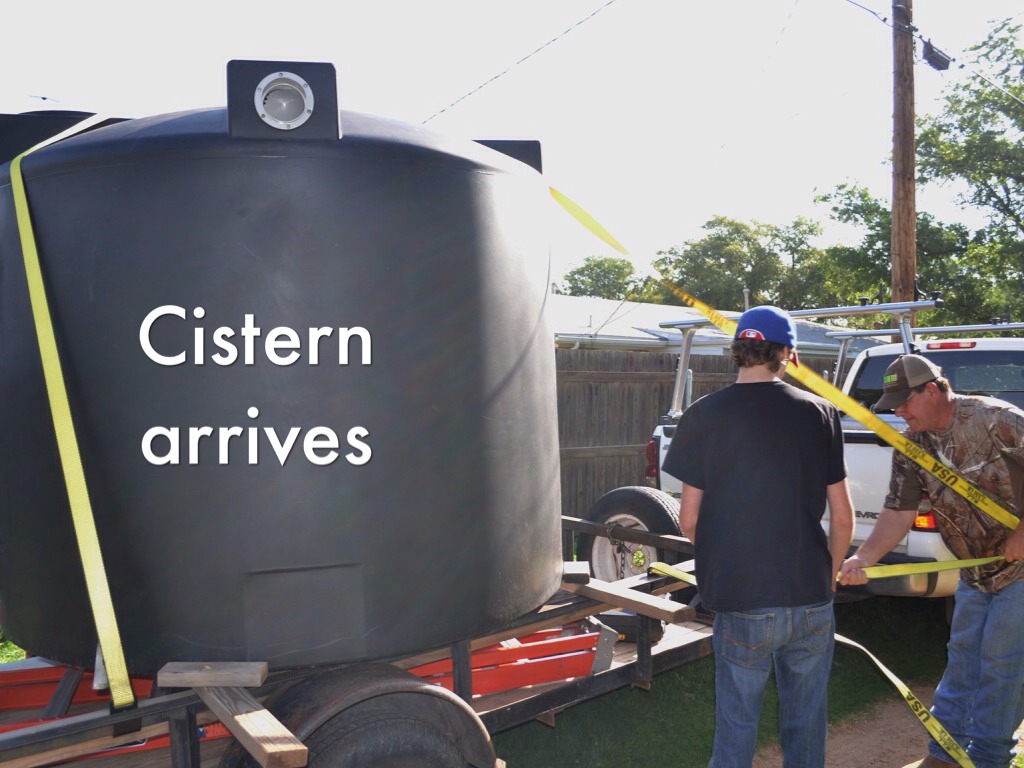 Complete set up – you can see the gutter, the first flush pipe, the intake pipe, and overflow outlet. The intake and overflow pipes are protected by screens to keep insects out