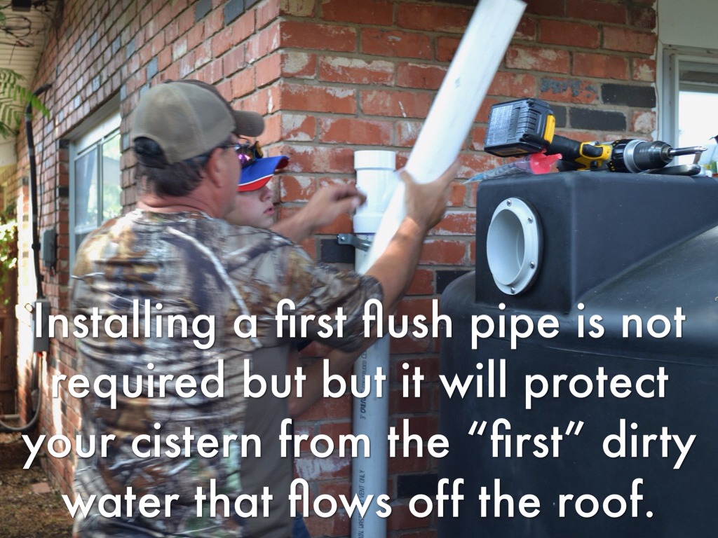 Installing a first flush pipe is not required but but it will protect your cistern from the “first” dirty water that flows off the roof. This is critical only if the water is to be potable.