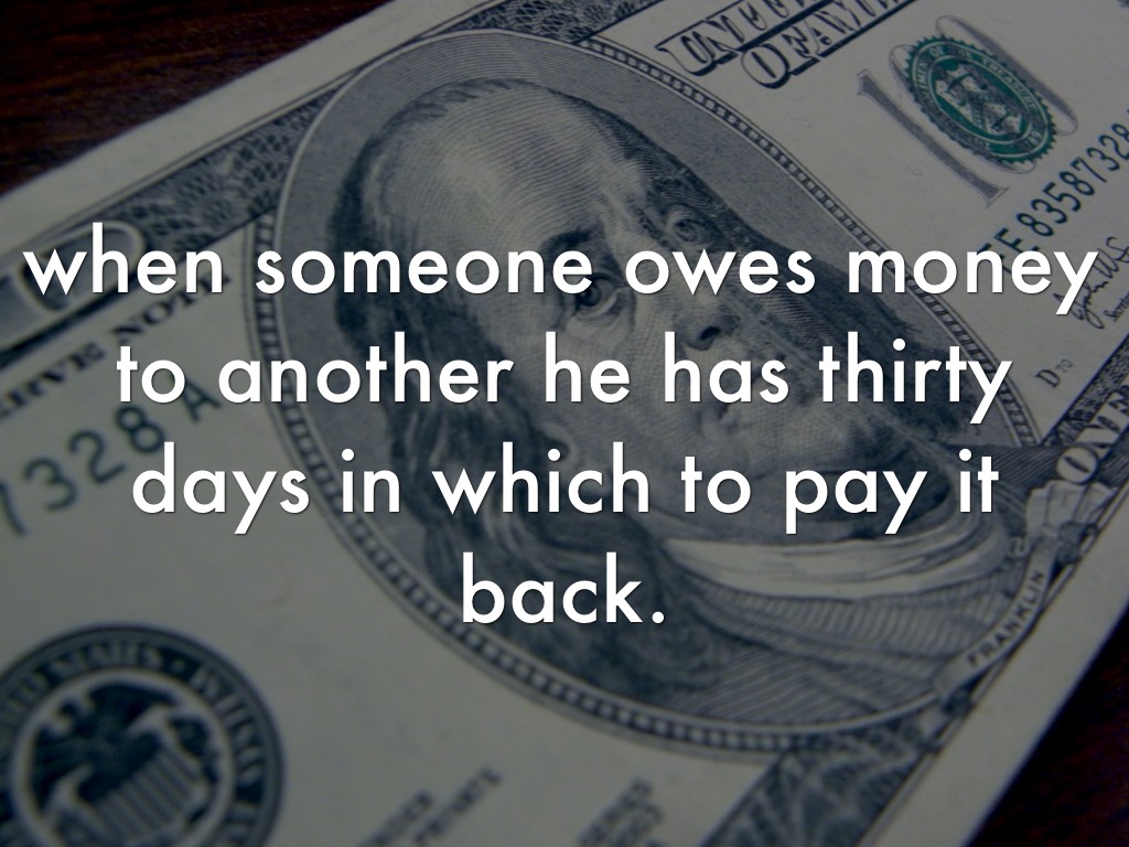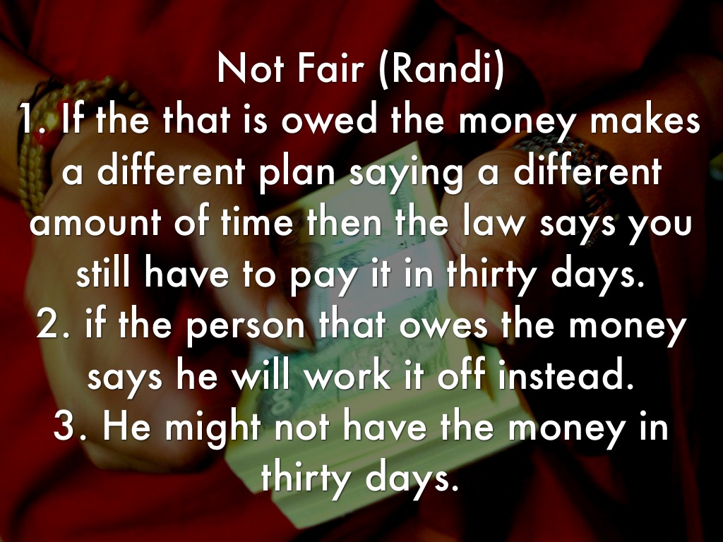 Not Fair (Randi) 1. If the that is owed the money makes a different plan saying a different amount of time then the law says you still have to pay it in thirty days. 2. if the person that owes the money says he will work it off instead. 3. He might not have the money in thirty days.