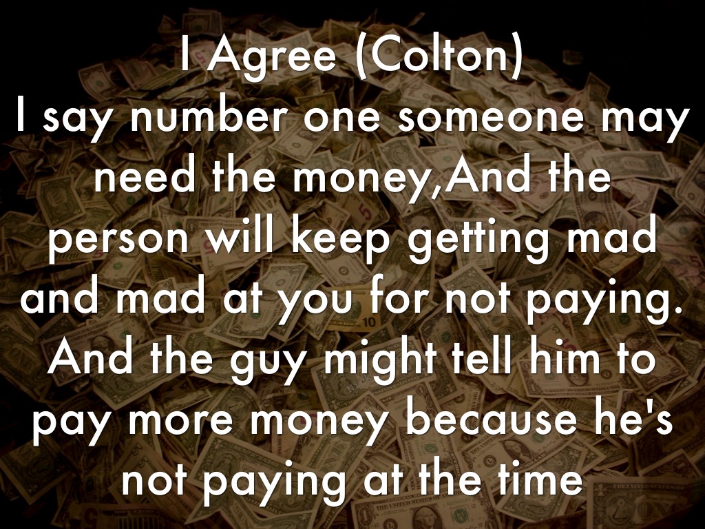 I Agree (Colton) I say number one someone may need the money,And the person will keep getting mad and mad at you for not paying. And the guy might tell him to pay more money because he's not paying at the time