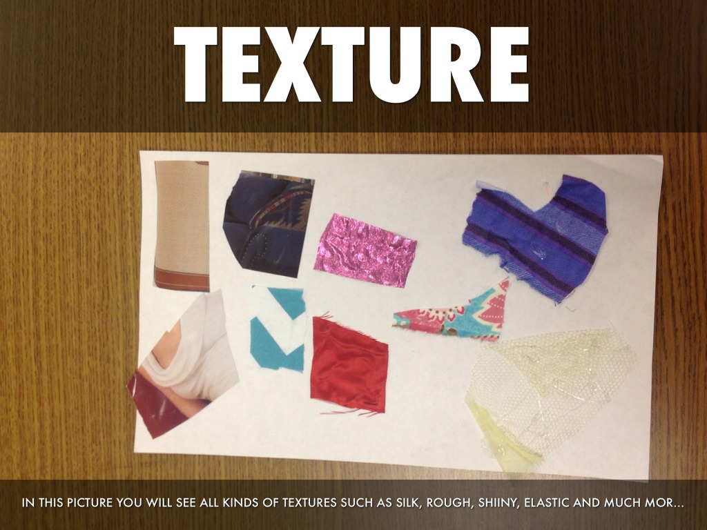 IN THIS PICTURE YOU WILL SEE ALL KINDS OF TEXTURES SUCH AS SILK, ROUGH, SHIINY, ELASTIC AND MUCH MORE..