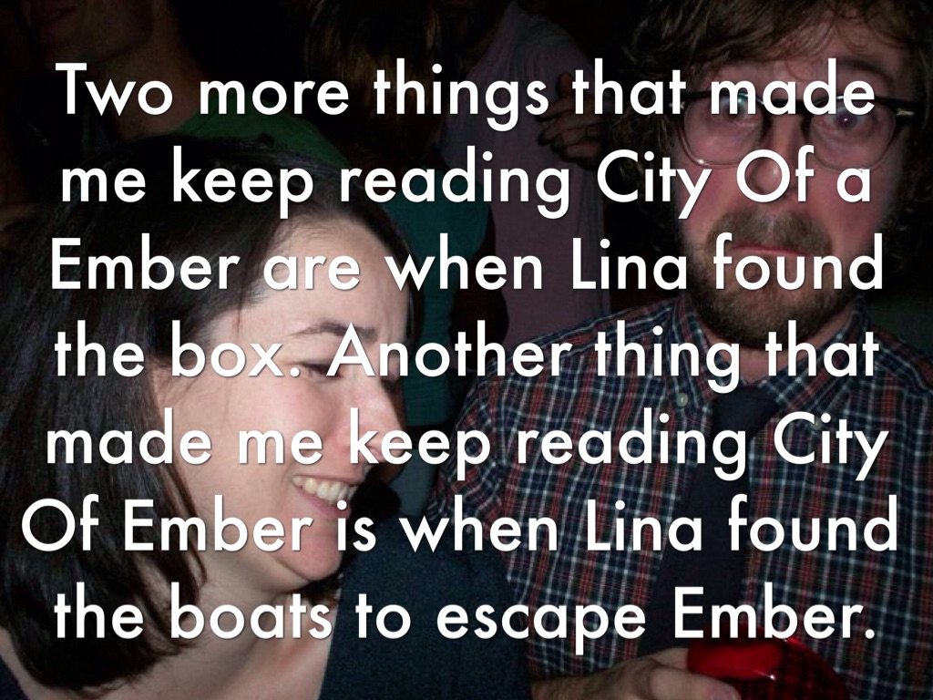 Two more things that made me keep reading City Of a Ember are when Lina found the box. Another thing that made me keep reading City Of Ember is when Lina found the boats to escape Ember.
