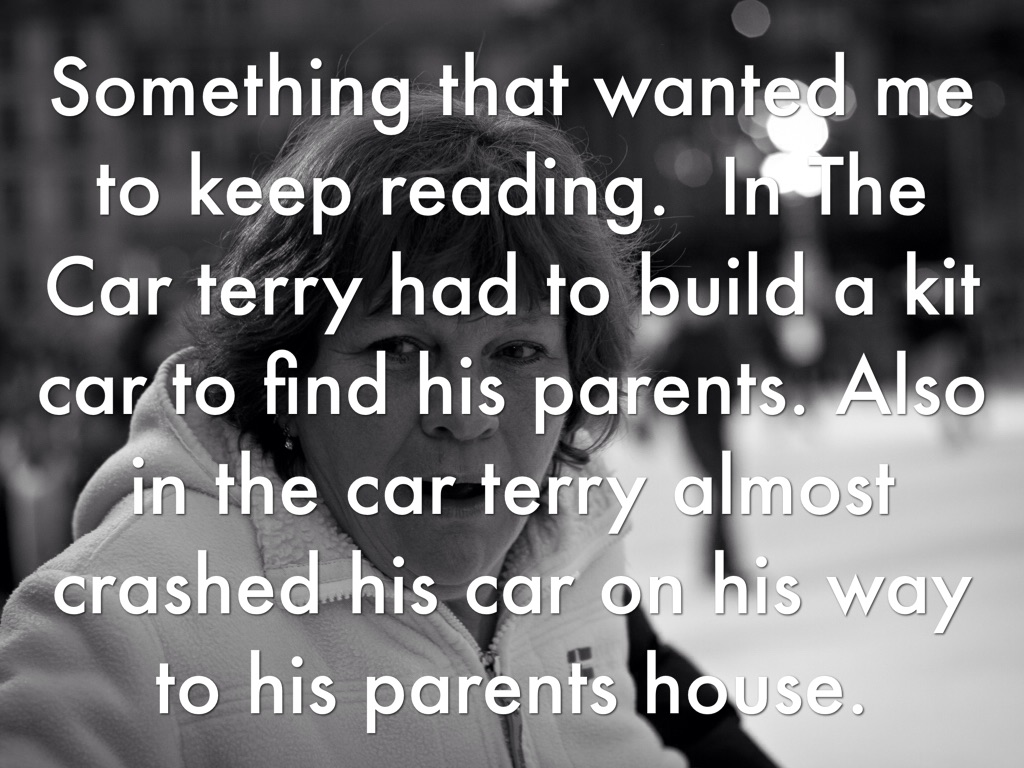 Something that wanted me to keep reading. In The Car terry had to build a kit car to find his parents. Also in the car terry almost crashed his car on his way to his parents house.