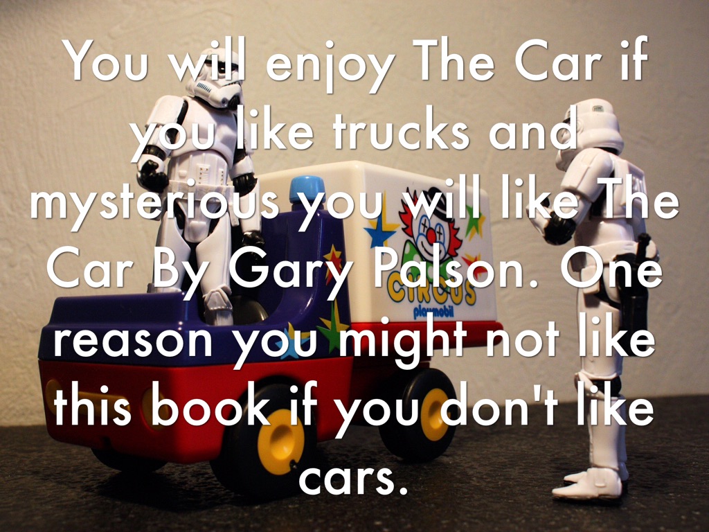 You will enjoy The Car if you like trucks and mysterious you will like The Car By Gary Palson. One reason you might not like this book if you don't like cars.