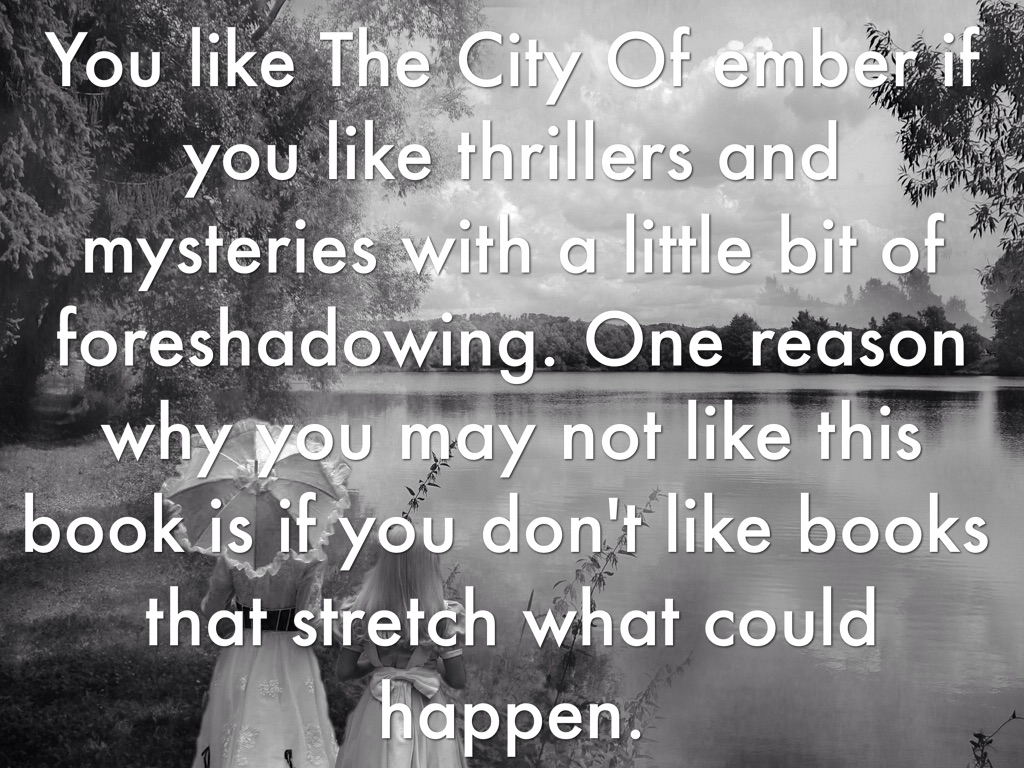 You like The City Of ember if you like thrillers and mysteries with a little bit of foreshadowing. One reason why you may not like this book is if you don't like books that stretch what could happen.