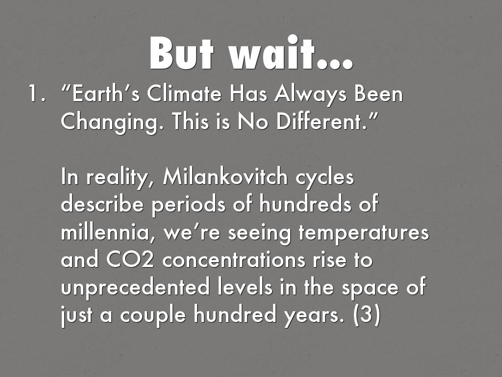 • “Earth’s Climate Has Always Been Changing. This is No Different.” In reality, Milankovitch cycles describe periods of hundreds of millennia, we’re seeing temperatures and CO2 concentrations rise to unprecedented levels in the space of just a couple hundred years. (3)
