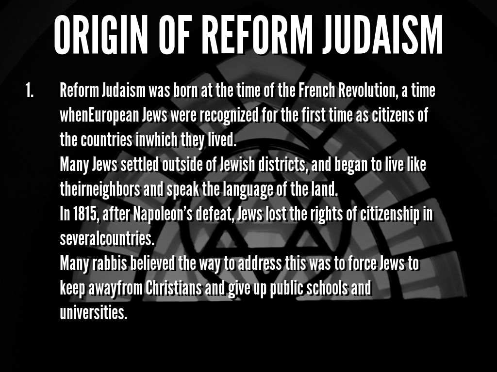Reform Judaism was born at the time of the French Revolution, a time whenEuropean Jews were recognized for the first time as citizens of the countries inwhich they lived.