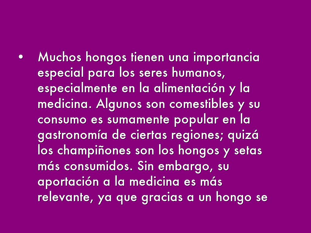 Muchos hongos tienen una importancia especial para los seres humanos, especialmente en la alimentación y la medicina. Algunos son comestibles y su consumo es sumamente popular en la gastronomía de ciertas regiones; quizá los champiñones son los hongos y setas más consumidos. Sin embargo, su aportación a la medicina es más relevante, ya que gracias a un hongo se elabora la penicilina, un antibiótico usado en el tratamiento de infecciones que ha salvado millones de vidas desde su descubrimiento en 1928.