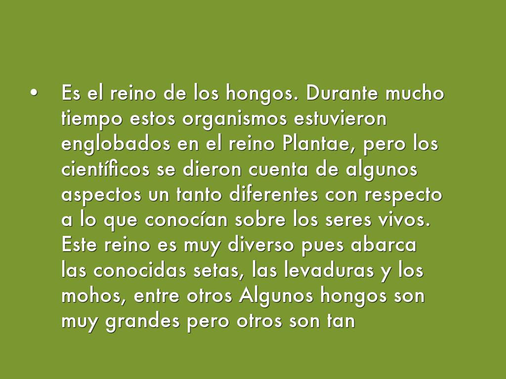 Es el reino de los hongos. Durante mucho tiempo estos organismos estuvieron englobados en el reino Plantae, pero los científicos se dieron cuenta de algunos aspectos un tanto diferentes con respecto a lo que conocían sobre los seres vivos. Este reino es muy diverso pues abarca las conocidas setas, las levaduras y los mohos, entre otros Algunos hongos son muy grandes pero otros son tan pequeños que sólo pueden verse bajo la lente de un microscopio. Su importancia es innegable en muchas áreas, tanto para el ser humano como para el medio ambiente en general.