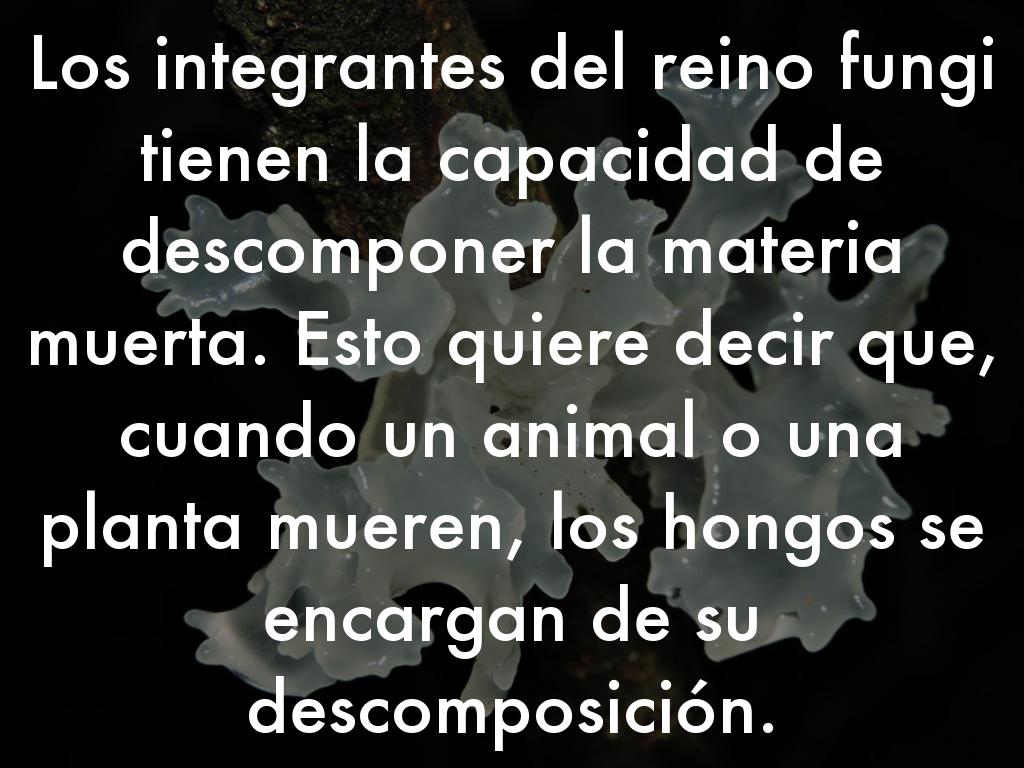Los integrantes del reino fungi tienen la capacidad de descomponer la materia muerta. Esto quiere decir que, cuando un animal o una planta mueren, los hongos se encargan de su descomposición.