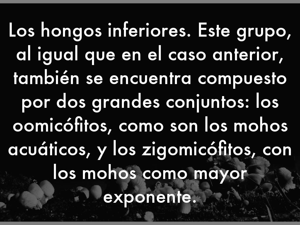 Los hongos inferiores. Este grupo, al igual que en el caso anterior, también se encuentra compuesto por dos grandes conjuntos: los oomicófitos, como son los mohos acuáticos, y los zigomicófitos, con los mohos como mayor exponente.