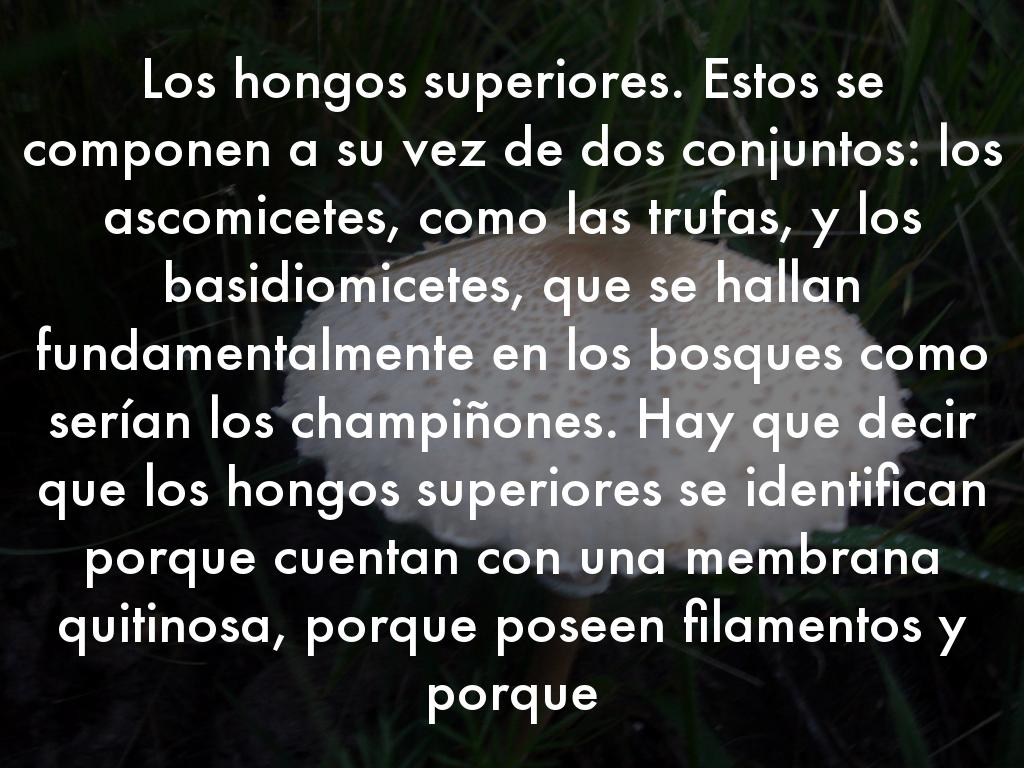 Los hongos superiores. Estos se componen a su vez de dos conjuntos: los ascomicetes, como las trufas, y los basidiomicetes, que se hallan fundamentalmente en los bosques como serían los champiñones. Hay que decir que los hongos superiores se identifican porque cuentan con una membrana quitinosa, porque poseen filamentos y porque