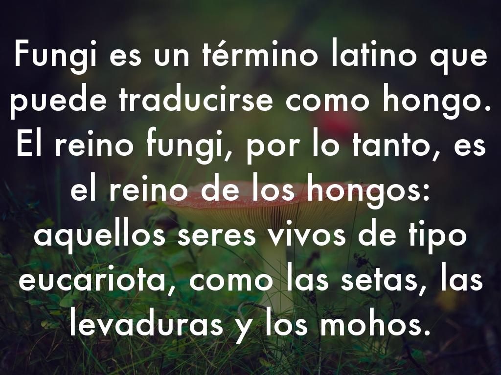 Fungi es un término latino que puede traducirse como hongo. El reino fungi, por lo tanto, es el reino de los hongos: aquellos seres vivos de tipo eucariota, como las setas, las levaduras y los mohos.