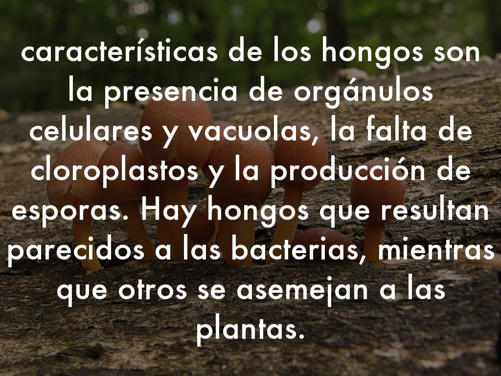 características de los hongos son la presencia de orgánulos celulares y vacuolas, la falta de cloroplastos y la producción de esporas. Hay hongos que resultan parecidos a las bacterias, mientras que otros se asemejan a las plantas.