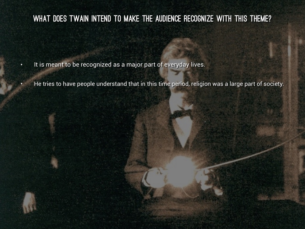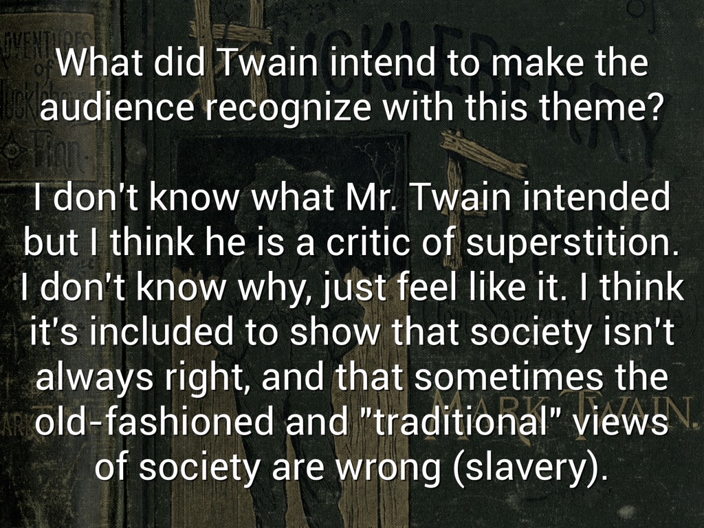 I don't know what Mr. Twain intended but I think he is a critic of superstition. I don't know why, just feel like it. I think it's included to show that society isn't always right, and that sometimes the old-fashioned and "traditional" views of society are wrong (slavery).