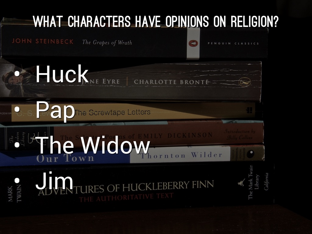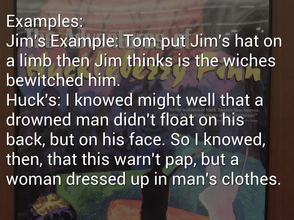 Examples: Jim's Example: Tom put Jim's hat on a limb then Jim thinks is the wiches bewitched him. Huck's: I knowed might well that a drowned man didn't float on his back, but on his face. So I knowed, then, that this warn't pap, but a woman dressed up in man's clothes.