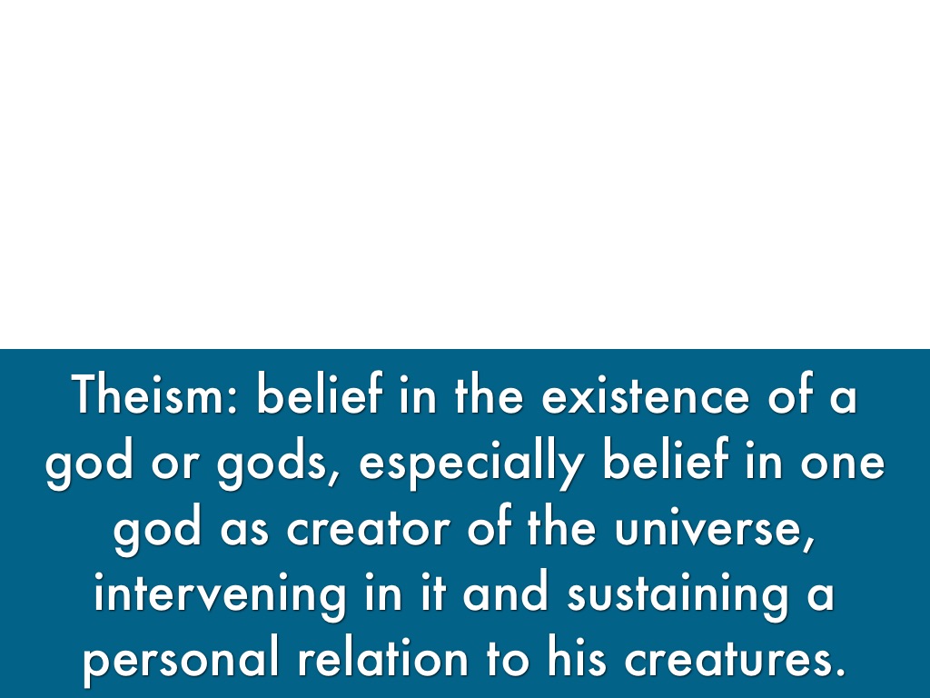 Theism: belief in the existence of a god or gods, especially belief in one god as creator of the universe, intervening in it and sustaining a personal relation to his creatures.