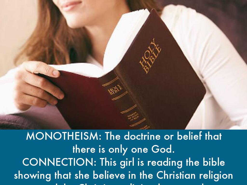 CONNECTION: This girl is reading the bible showing that she believe in the Christian religion and the Christian religion has a god.