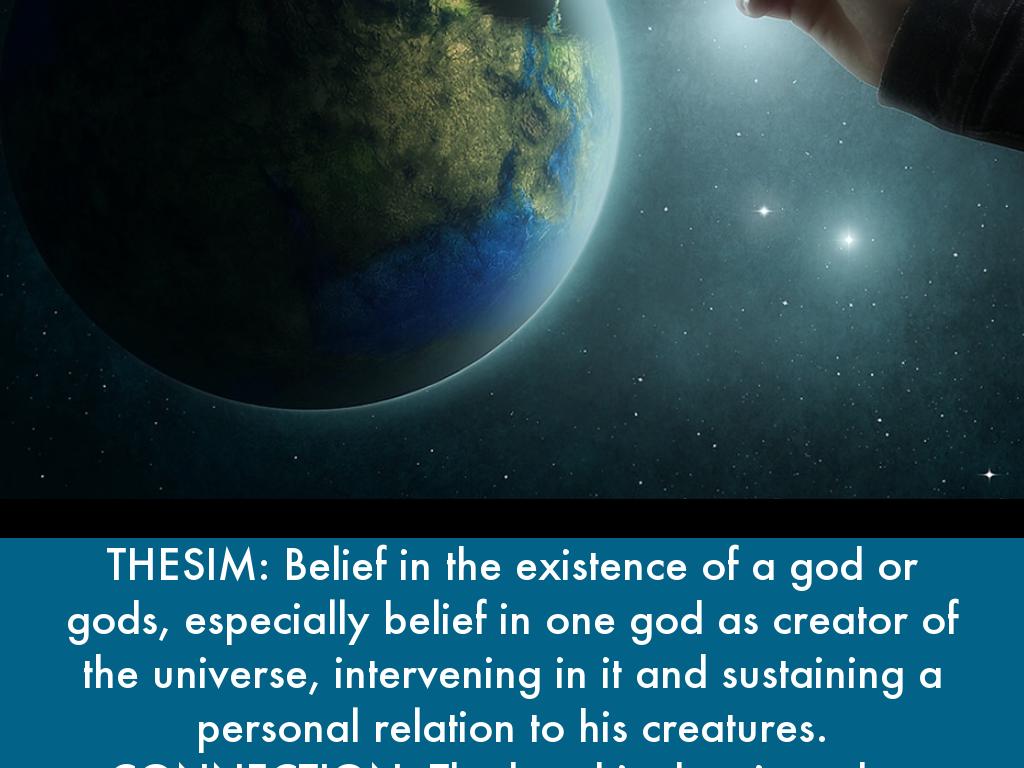 THESIM: Belief in the existence of a god or gods, especially belief in one god as creator of the universe, intervening in it and sustaining a personal relation to his creatures.