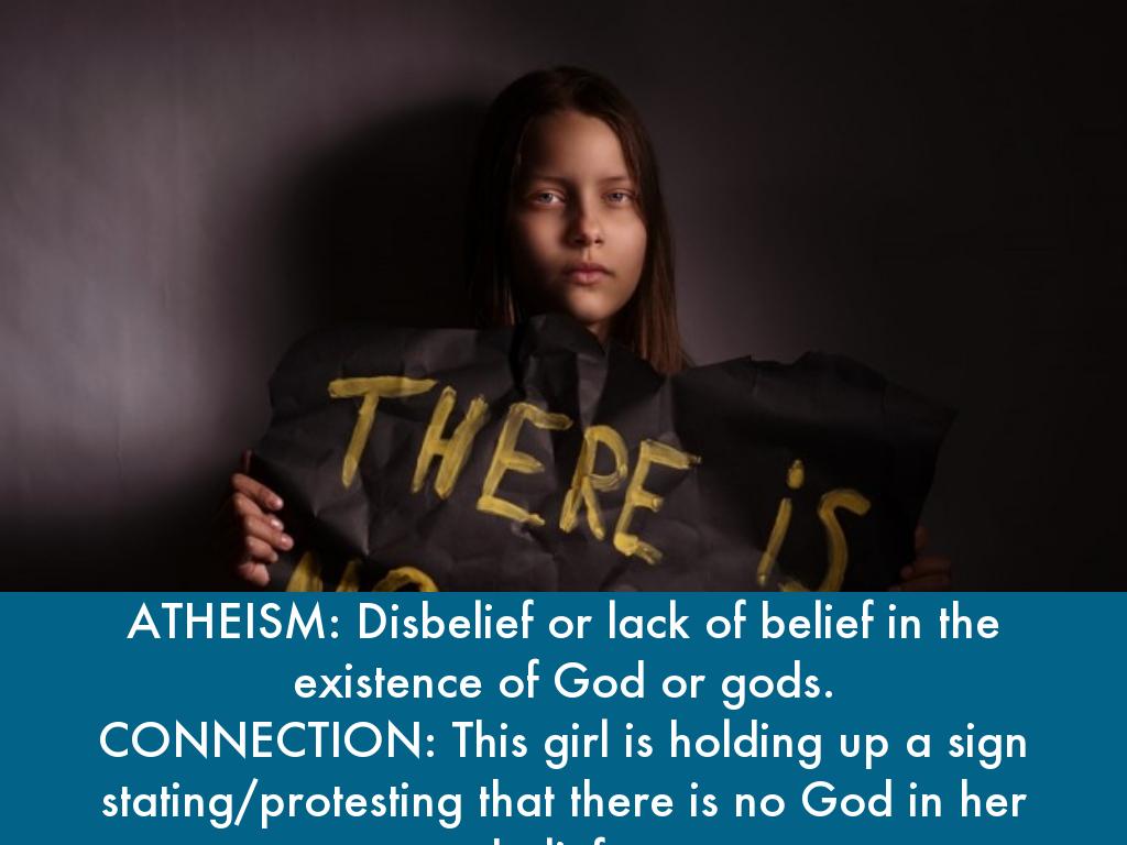 CONNECTION: This girl is holding up a sign stating/protesting that there is no God in her beliefs.