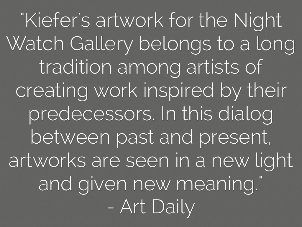"Kiefer's artwork for the Night Watch Gallery belongs to a long tradition among artists of creating work inspired by their predecessors. In this dialog between past and present, artworks are seen in a new light and given new meaning." - Art Daily