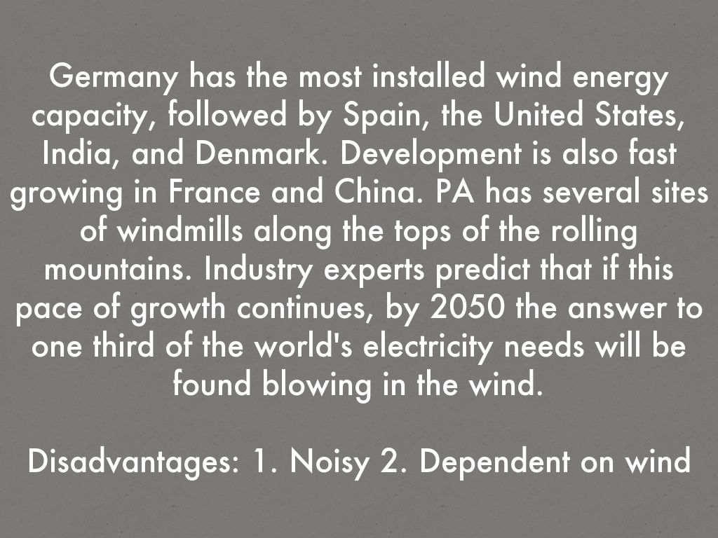 Germany has the most installed wind energy capacity, followed by Spain, the United States, India, and Denmark. Development is also fast growing in France and China. PA has several sites of windmills along the tops of the rolling mountains. Industry experts predict that if this pace of growth continues, by 2050 the answer to one third of the world's electricity needs will be found blowing in the wind.