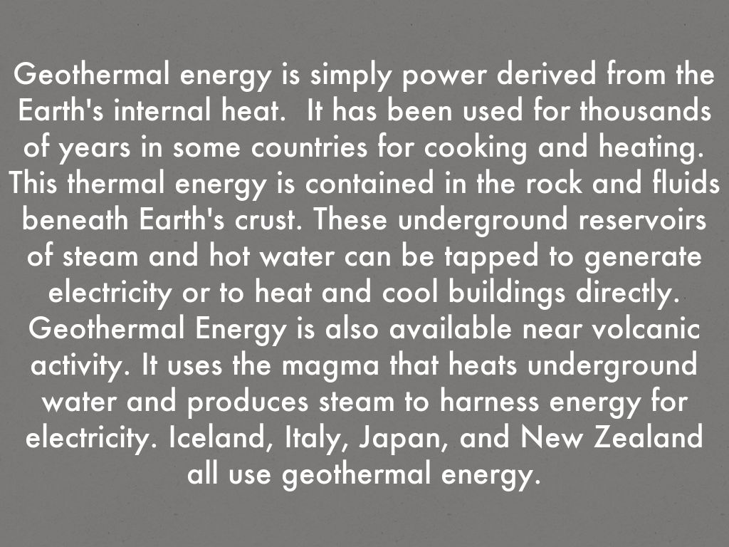 Geothermal energy has been used for thousands of years in some countries for cooking and heating. It is simply power derived from the Earth's internal heat.This thermal energy is contained in the rock and fluids beneath Earth's crust.