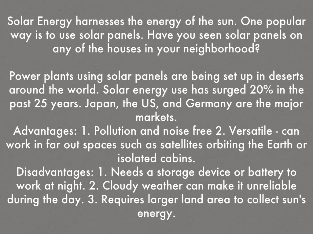 Disadvantages: 1. Needs a storage device or battery to work at night. 2. Cloudy weather can make it unreliable during the day. 3. Requires larger land area to collect sun's energy.