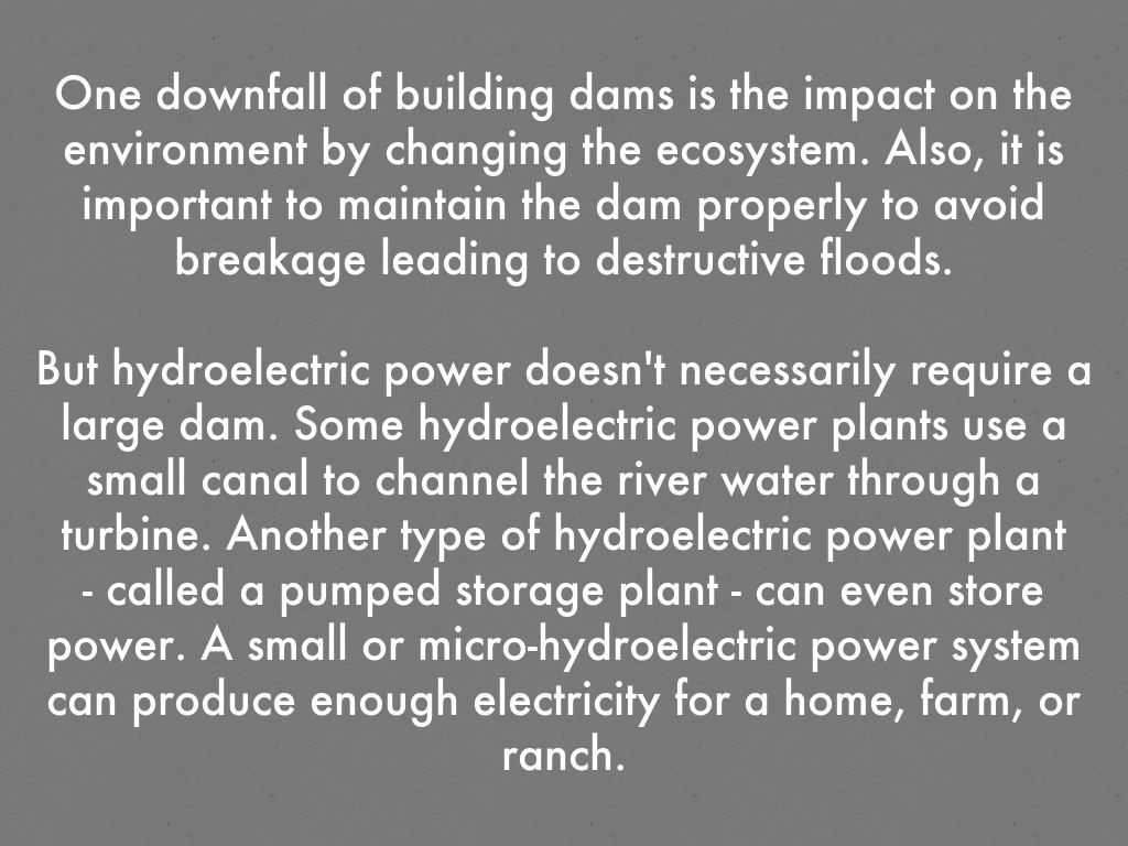 The most common type of hydroelectric power plant uses a dam on a river to store water in a reservoir. Water released from the reservoir flows through a turbine, spinning it, which in turn activates a generator to produce electricity. One downfall of building dams is the impact on the environment. Also, it s important to maintain the dam properly to avoid breakage leading to floods.
