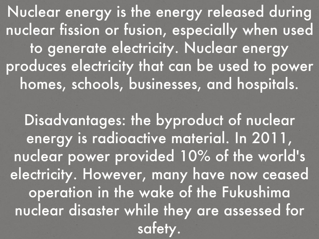 Disadvantages: the byproduct of nuclear energy is radioactive material. In 2011, nuclear power provided 10% of the world's electricity. However, many have now ceased operation in the wake of the Fukushima nuclear disaster while they are assessed for safety.