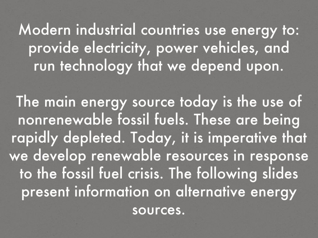 The main energy source today is the use of nonrenewable fossil fuels. These are being rapidly depleted. Today, it is imperative that we develop renewable resources in response to the fossil fuel crisis. The following slides present information on alternative energy sources.