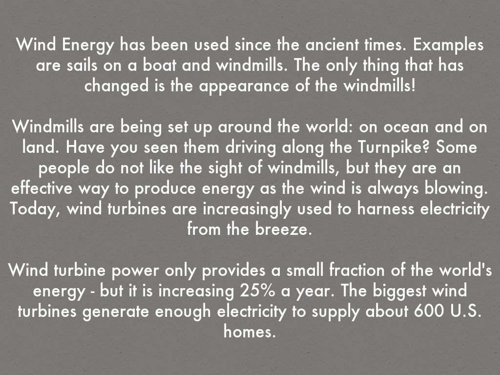 Wind Energy has been used since the ancient times. Examples are sails on a boat and windmills. The only thing that has changed is the appearance of the windmills!