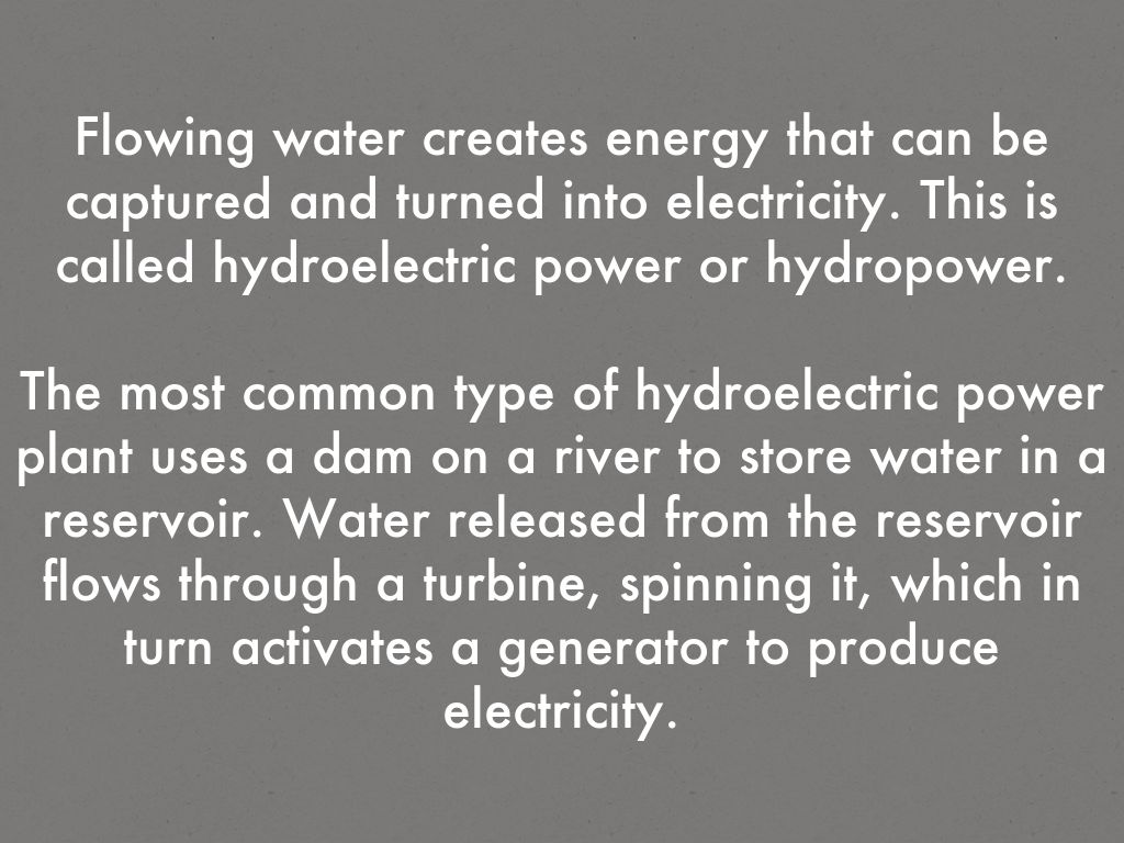 Flowing water creates energy that can be captured and turned into electricity. This is called hydroelectric power or hydropower.