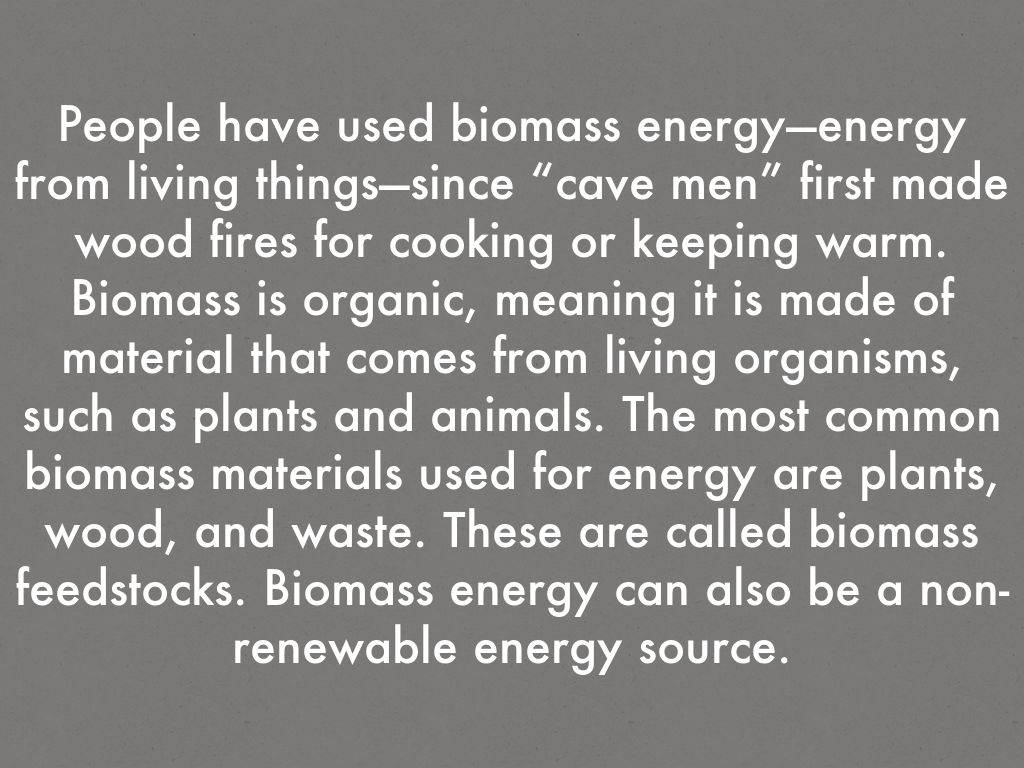 People have used biomass energy—energy from living things—since the earliest “cave men” first made wood fires for cooking or keeping warm.